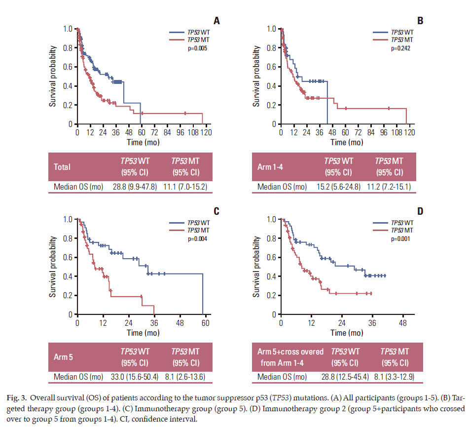 위 그래프에서 볼 수 있듯이, TP53 변이가 있는 환자군은 변이가없는 환자군에 비해 전체 생존 기간(11.1개월 vs 28.8개월)과 무진행 생존 기간(1.7개월vs 3.8개월) 모두 유의미하게 짧은 것으로 확인되었습니다. 특히 면역항암제 치료를 받은 환자군에서 TP53 변이 여부에 따른생존 기간 차이가 두드러졌으며, 다변량 분석 결과 TP53 변이는다른 임상적 요인과 무관하게 독립적으로 나쁜 예후를 시사하는 강력한 인자임이 입증되었습니다. 이는 TP53 변이가 두경부암의 공격적인 특성 및 최신 표적/면역 치료에대한 저항성과 밀접한 관련이 있음을 보여줍니다.