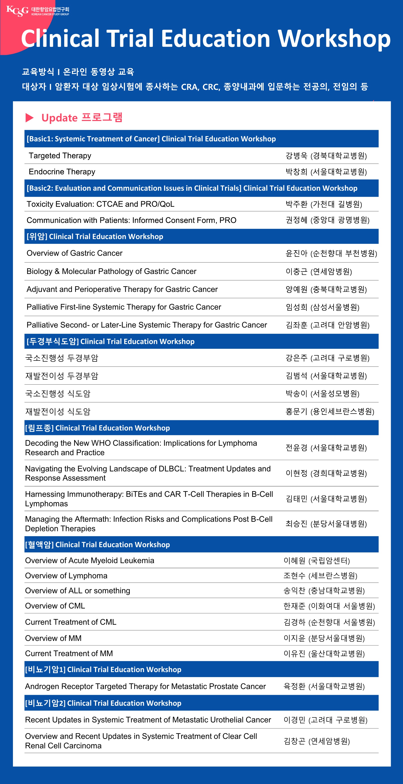 매해 강의를 점검하여 최신 임상시험 트렌드를 반영하고 개편하고 있으며, 올해는 대대적으로 Basic, 위암, 두경부식도암, 림프종, 혈액암, 비뇨기암 일부를 개편하였습니다. 새로 업데이트된 교육에 많은 신청과 참여 부탁드립니다. [온라인 교육 신청하기]