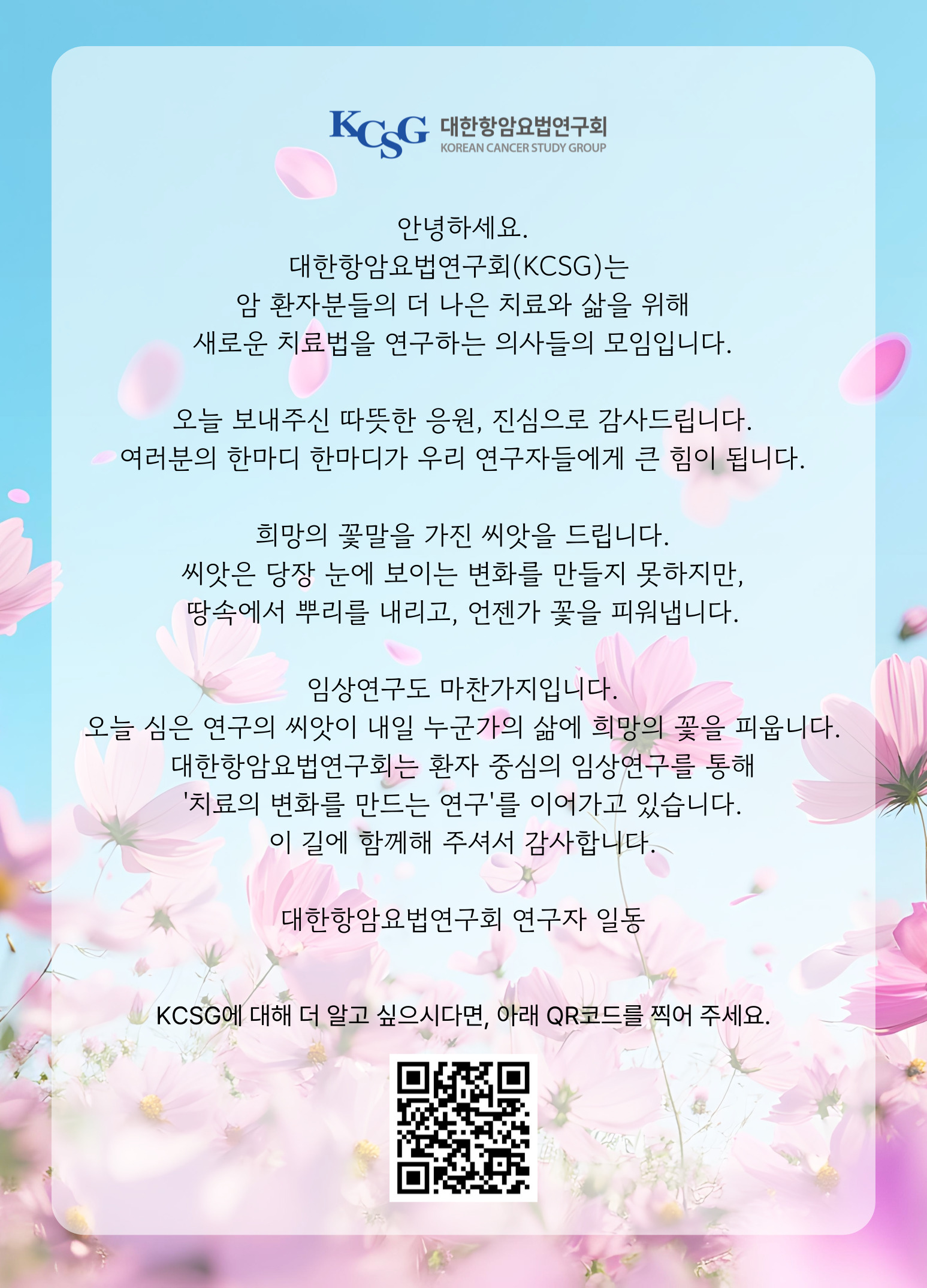 많은 분들이 KCSG의 임상연구와 새로운 치료 개발 과정에 관심과 응원을 보내주셨습니다.