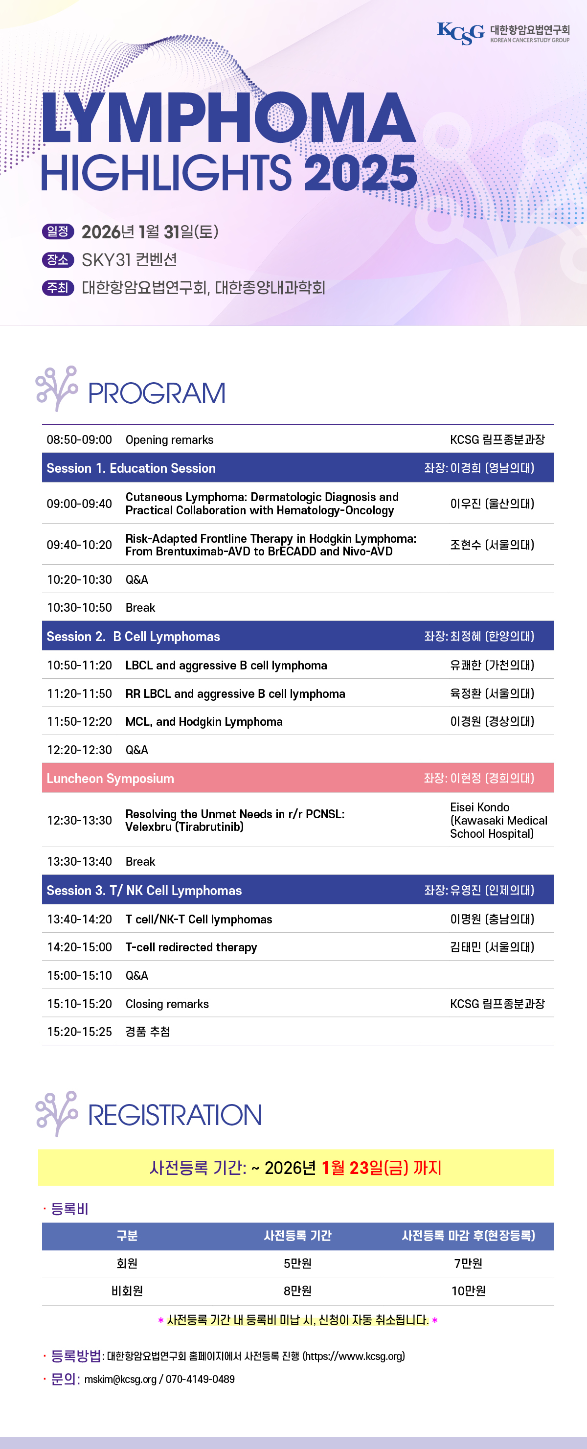 | 11:20 - 11:45 | 25 min | RR LBCL and aggressive B cell lymphoma | 육정환 (서울의대) |